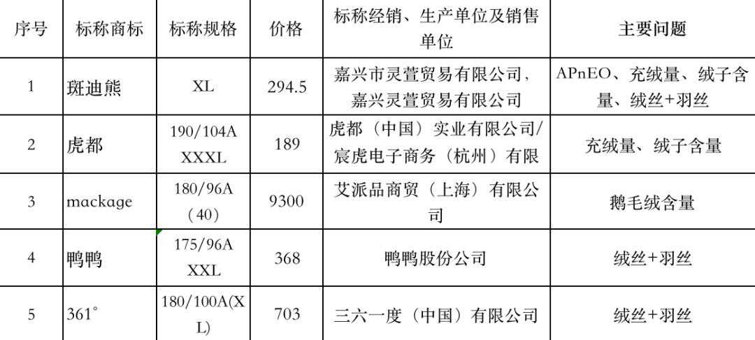 标准要求,羽绒服装必须标明充绒量、绒子含量。结果发现,部分品牌充绒量或绒子含量的实测含量比宣称的少,绒丝+羽丝含量超过标准限值。其中斑迪熊在充绒量、绒子含量等多项测试指标均存在问题。如其产品标签明示绒子含量为90%白鸭绒,充绒量380g,实测绒子含量仅36.7%鸭绒,充绒量仅292g;其实测绒丝+羽丝含量为47.3%,超过标准的4倍(标准值:≤10%)。