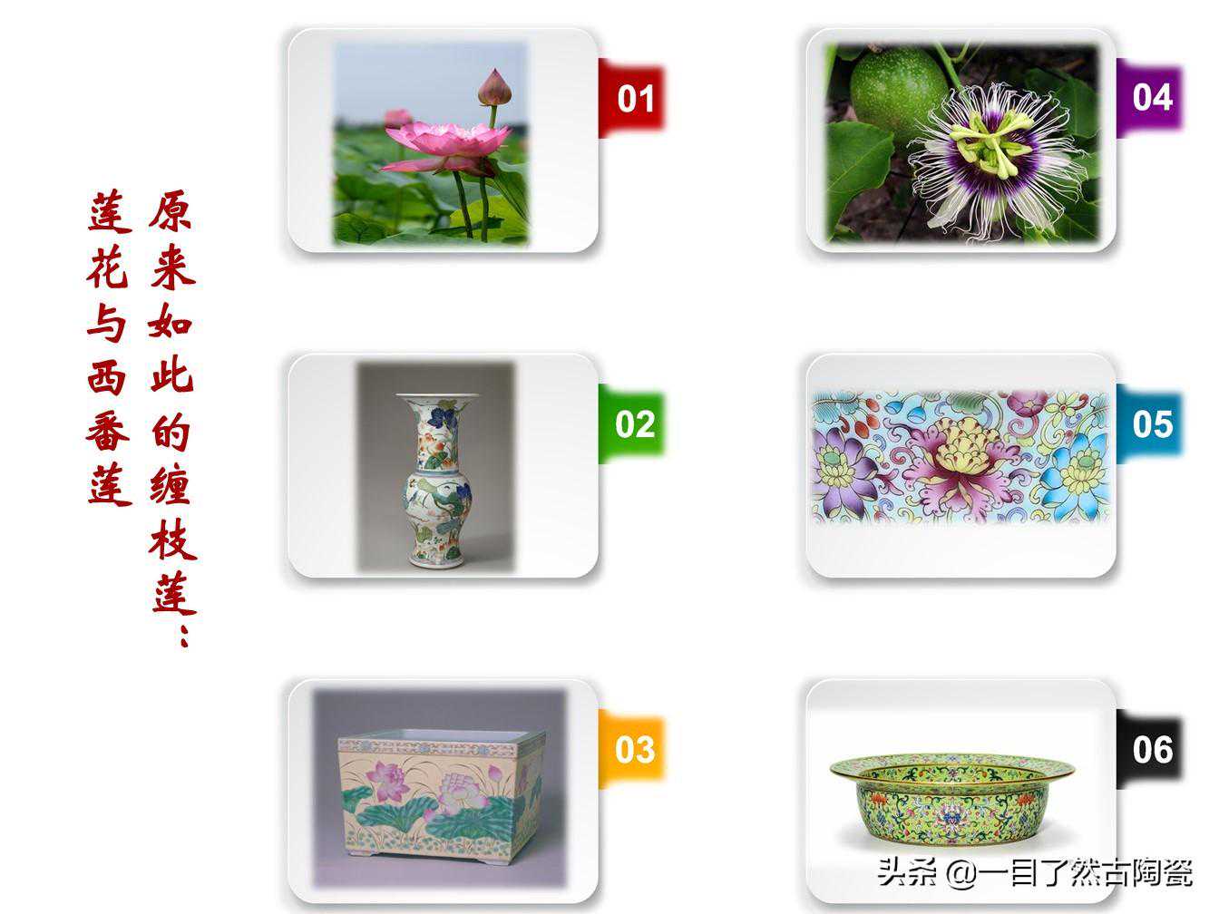 前面DIY的几个图都是捎带的。今天的重点来了,瓷器中同样叫“莲纹”的莲纹好像不一样,有的是我们认知中的莲花,更多的缠枝莲枝藤叶茂不像莲花,而且这种缠枝莲还是瓷器纹饰的主流……这种莲叫做西番莲。它确实不是水中植物,是藤本类的,源于印度,随印度佛教文化传入中国,果实就是百香果,偶有网文说与百香果不同。