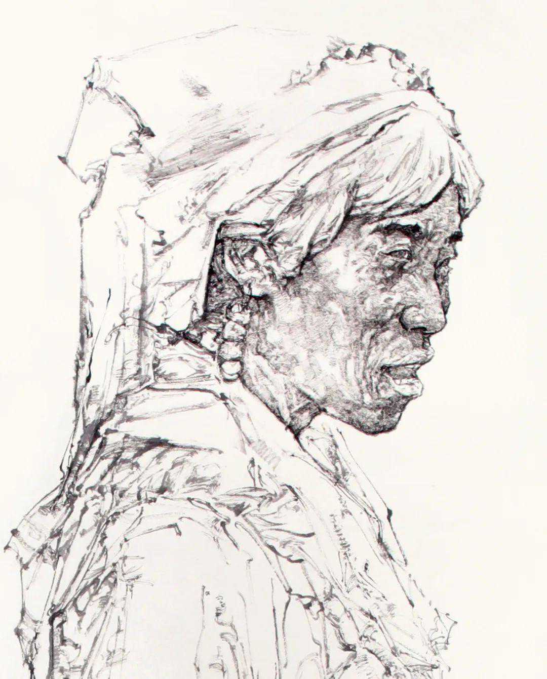 意笔白描1意笔白描系列的组画以少数民族的题材为主,这组照片早年来自我与导师在研究生期间艺术考察时留存下来的素材。在设计这套课稿时就想到白描的形式,因为在教学过程中,写意人物画的难度较大,许多学生在训练过程中都有畏难情节,所以在授课过程中把不同的方式分解来加强对写意画的理解与认识,因此在课程设计中加入了人物速写的量,同时意笔的白描形式与之相呼应。在衔接过程中不事先讲太多的理论知识和笔墨干湿等要求,要求放笔直取、干笔皴擦及强调用笔的提按转折等。这样学生接受起来相对有些过度及抓手,会容易些。此系列作品均尺寸较大,绘制过程中激情满满,强调白描线的形式感及节奏,人物的面部及手部相对深入,强调了体积与结构的处理。