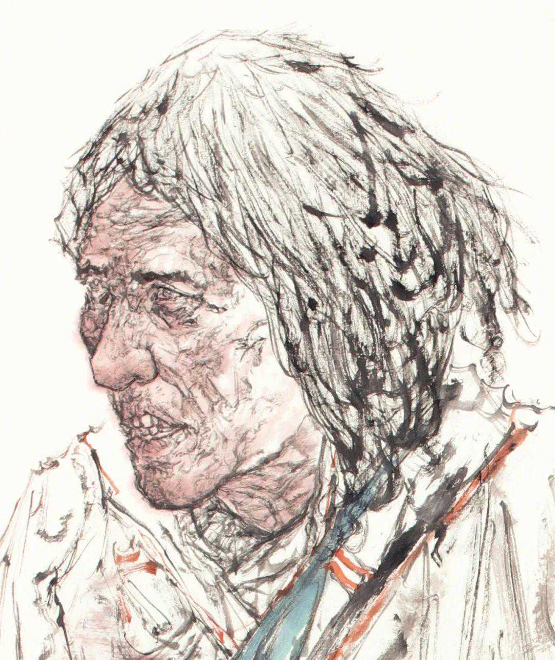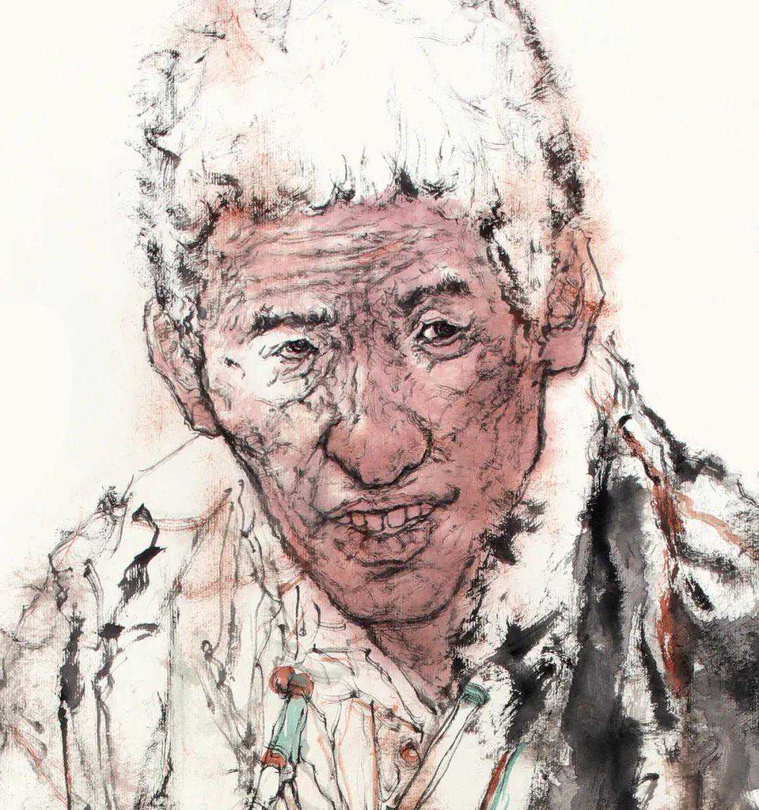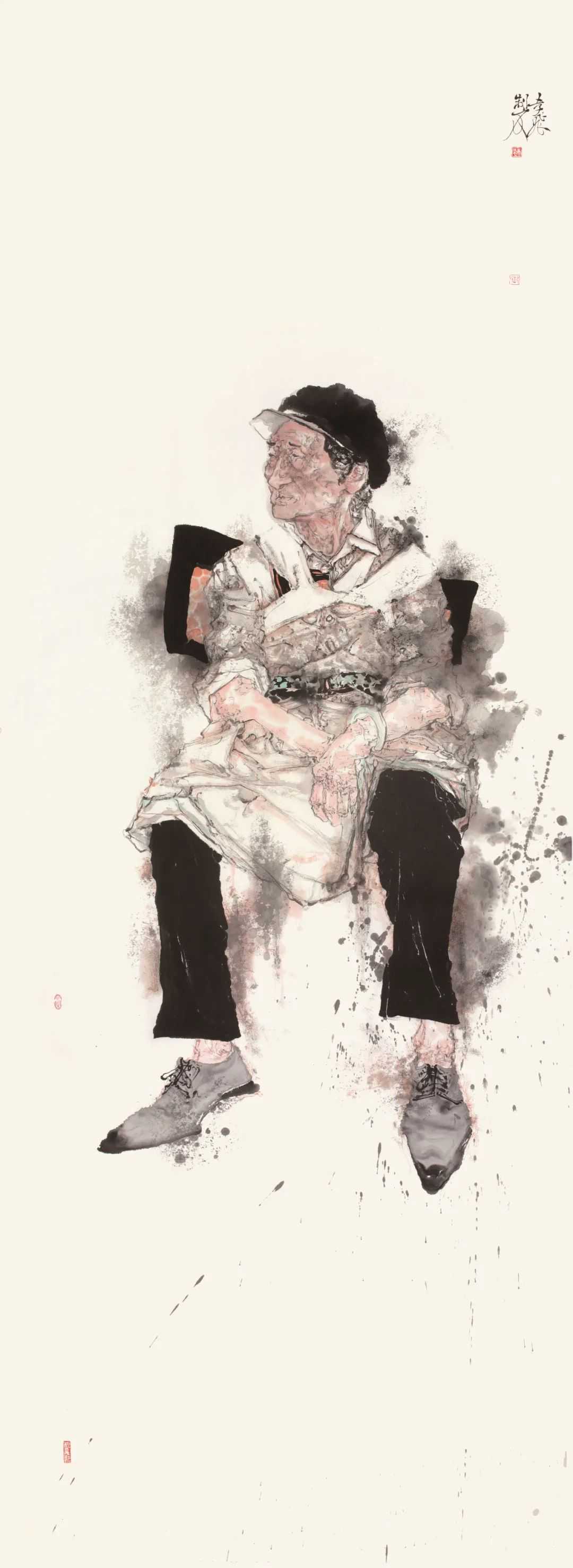 藏族老人1老人与妇女是高原上较多的形象,尤其老人的形象大多非常入画,由于民族特色藏族老人形象“味道”十足,在大量的作品中都有所表现。系列作品中强调了传统的用笔:中锋侧锋的大量使用,同时辅以淡墨块处理,增加画面的节奏感;设色方面以赭石、曙红、胭脂等调合突出染法的合理使用,增加了人物的苍桑感。