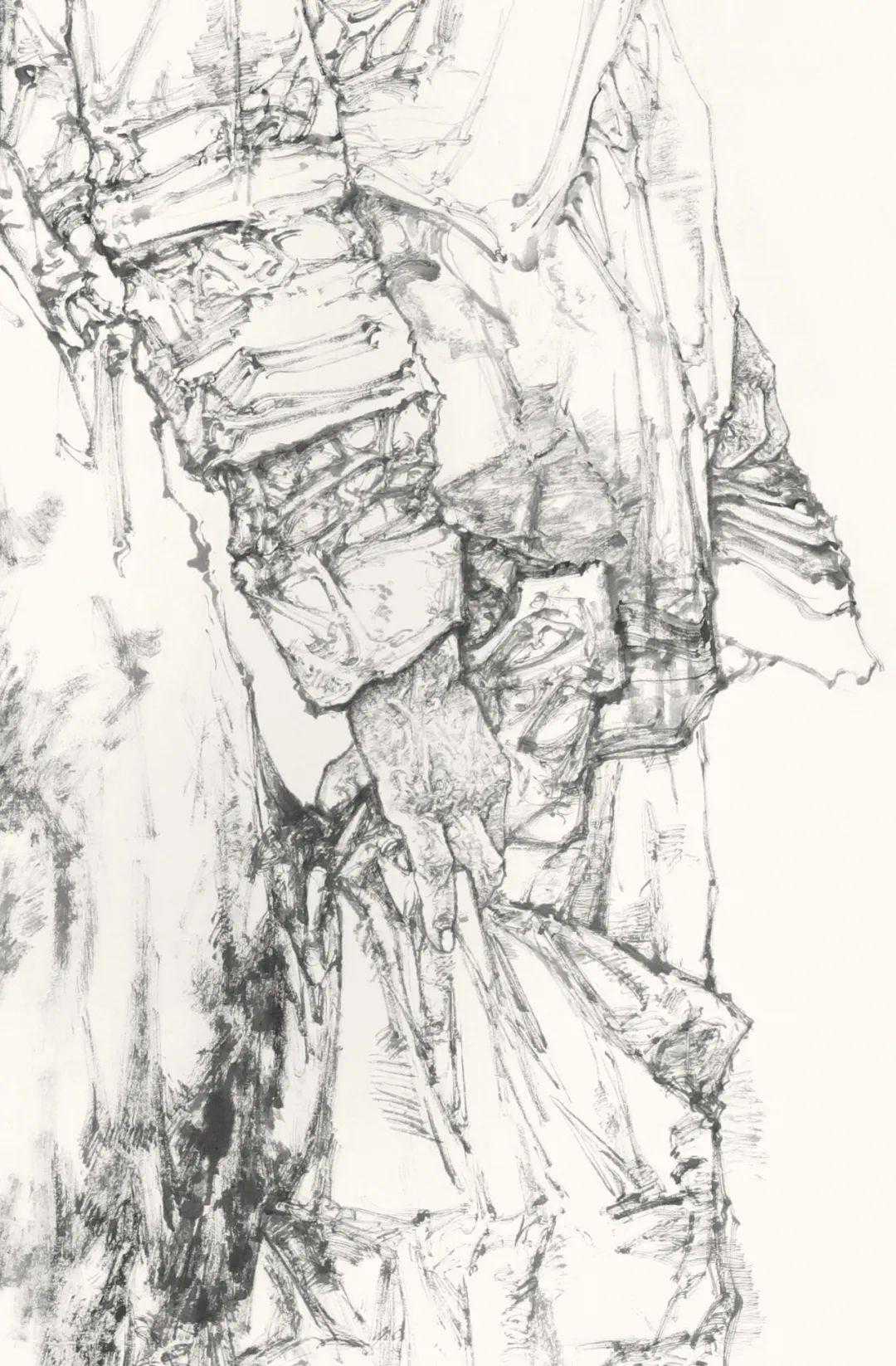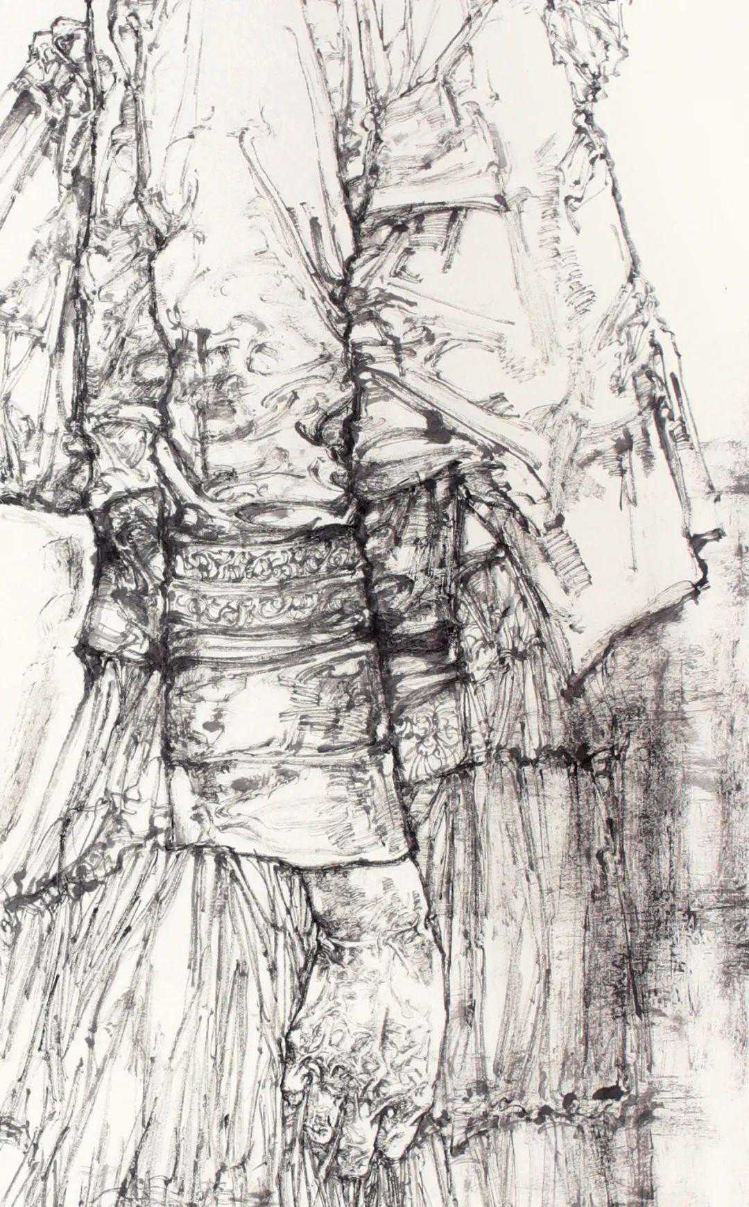 意笔白描2这张作品亦是以少数民族的形象为主体塑造,人物的动势较大,形象特征颇有画味。头部与手部的处理相对深入,服饰的处理着重线的节奏韵味,提炼出主体特征,放掉多余的细节。绘制过程应当是在尊重对象的同时主观提炼,少数民族的服饰有时候较为复杂,细节众多,在工笔画人物画中多有体现,但作为写意人物画则需进行部分取舍方能得其韵味,同时也能体现绘者的风格样貌及内心追求。