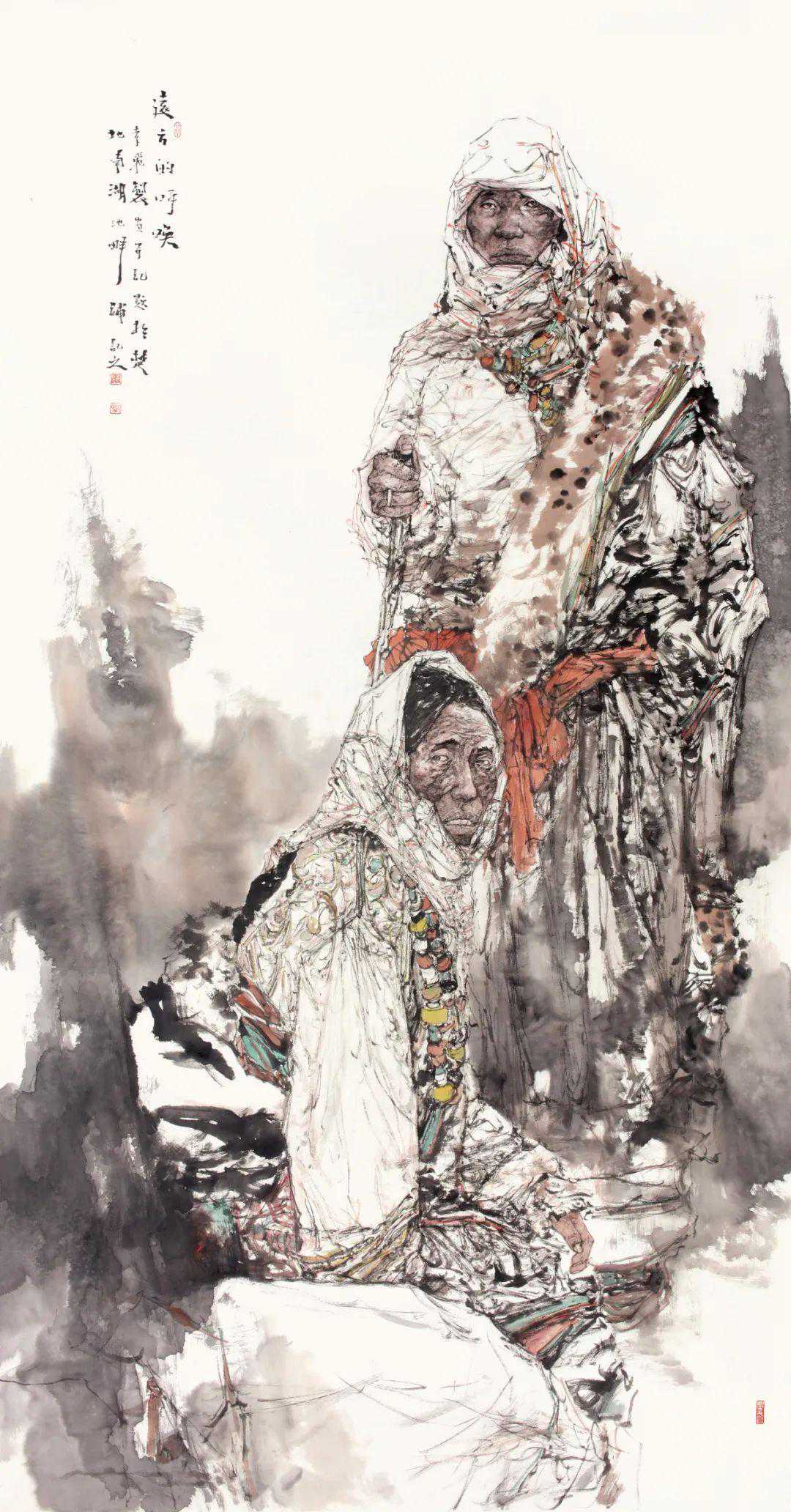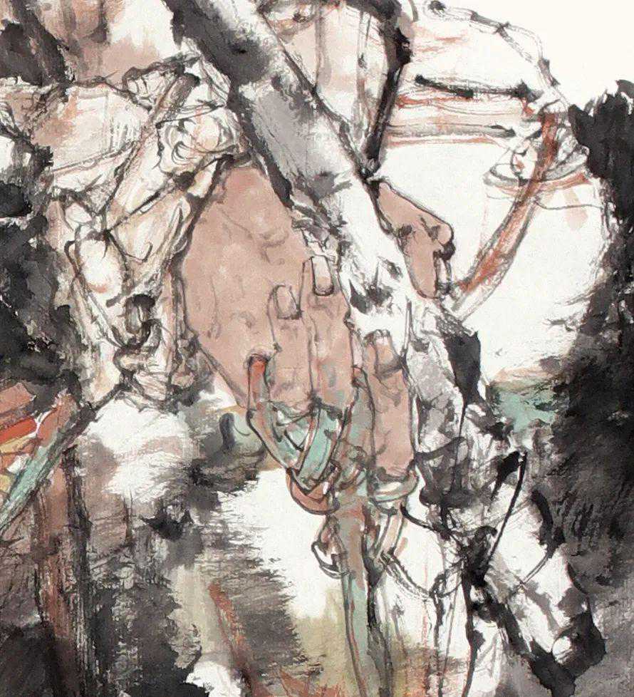 归途归途这幅作品个人较为喜欢,风雪之中的藏民及牦牛的陪伴是草原上的生态之一。人物以线及墨块铺陈,牦牛以没骨画法为主,其余皆以线入画,整体作品节奏追求明快、厚重。