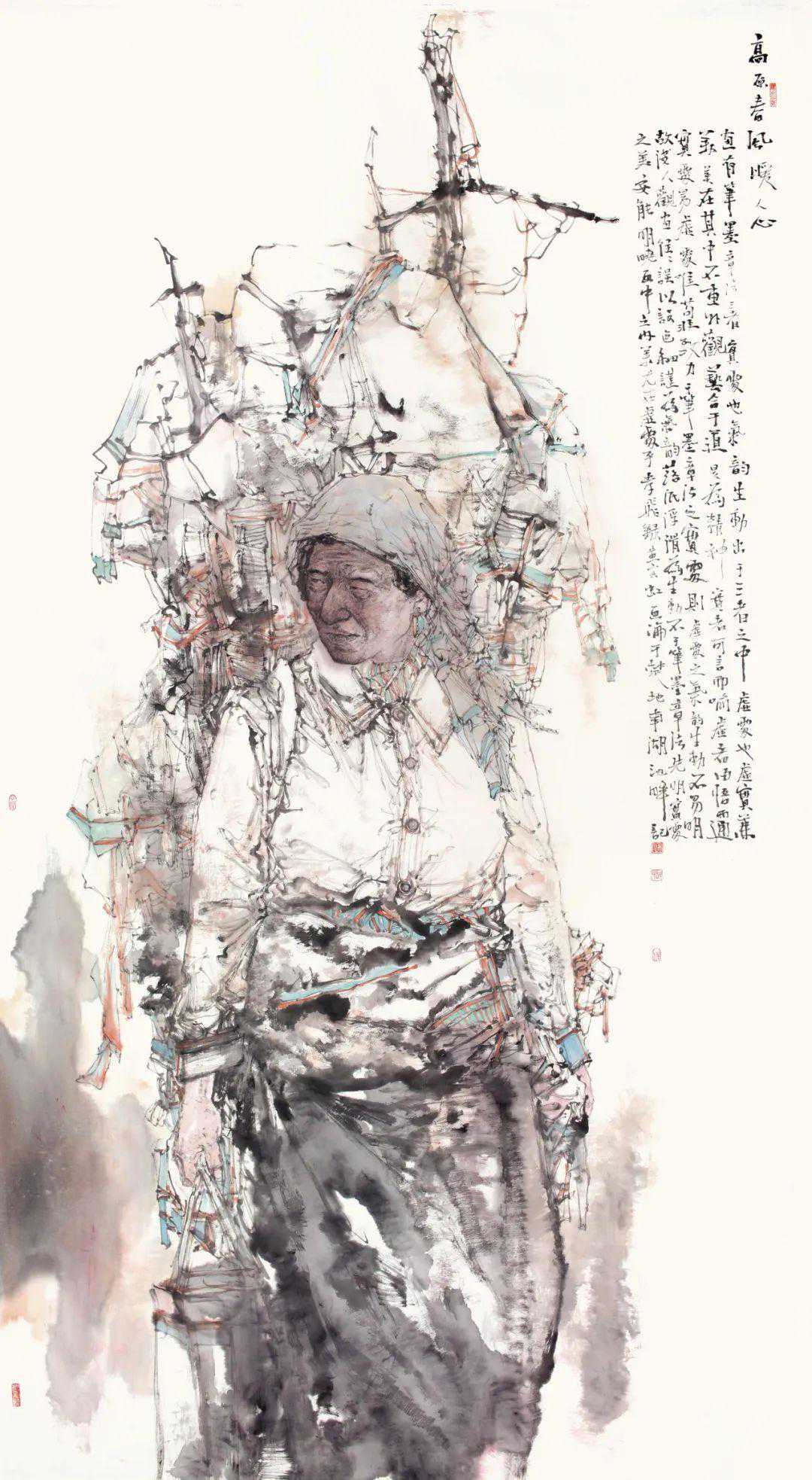 高原春风通过此前的训练与总结,从此幅作品开始,尺幅变为六尺整张。有的人物数量增加为两人或更多,通过单人或组合形成较为复杂的笔墨关系,画面的节奏与尺幅的增加同时进行调整,包括构图,黑白关系等。线条与墨块依然成为主打,题款及钤印也注意布局关系,成为整张作品的必备元素之一,人物背篓的大小也依据画面关系,人为做了部分夸张以适应构图。