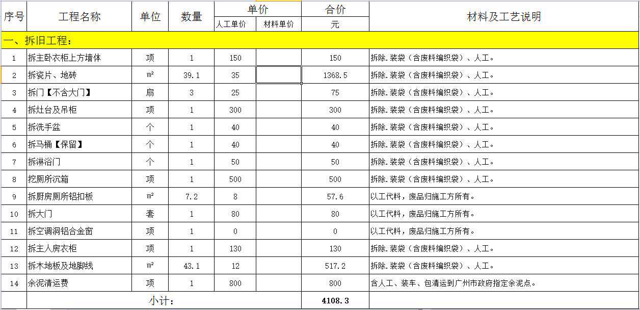 编号工程项目单位单价数量小计一、打拆工程1拆除60mm至120mm厚砖墙拆除费平方米4202拆除180mm至240mm厚砖墙拆除费平方米5703砖砌灶台拆除米9804整套木制橱柜拆除米7705拆原门或淋浴间个4206拆窗户个8207铲除墙面批荡(或)地面找平层平方米2708铲除地面砖平方米3909铲除墙面砖平方米36010拆除旧天花(包含角线)平方米16011拆除石膏线米6012浴缸(或)砖砌洗手台拆除个98013座厕(或)洗手盆拆除个45014拆除木阁楼(不包搬运)平方米110015拆除水泥预制板阁楼平方米145016拆除木制衣柜(或)书柜或书台平方米28017拆除地毯平方米7018拆除木地板(包含木脚线)平方米15019拆瓷砖(或)石地脚线米8020暗凿地脚线米8021拆除木地台平方米15022拆除水泥地台(厚度不超过15公分)平方米110023挖沉箱平方米160024打拆余泥垂直搬运费、装卸机械人工费(打拆部分)车260025余泥清运运费车4000小计0二、水电工程
