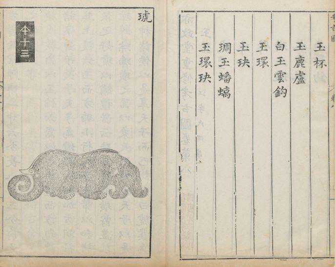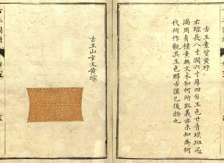 譬如《古玉图谱》,传为南宋时所敕撰。全书共三十二卷,分为国宝部、压胜部、服御部、文房部、鼎彝部、彛器部、乐器部,记载了南宋时期皇宫中所藏玉器,每器附图一或二,附文一篇,叙其尺寸、形制、纹饰及器用等。