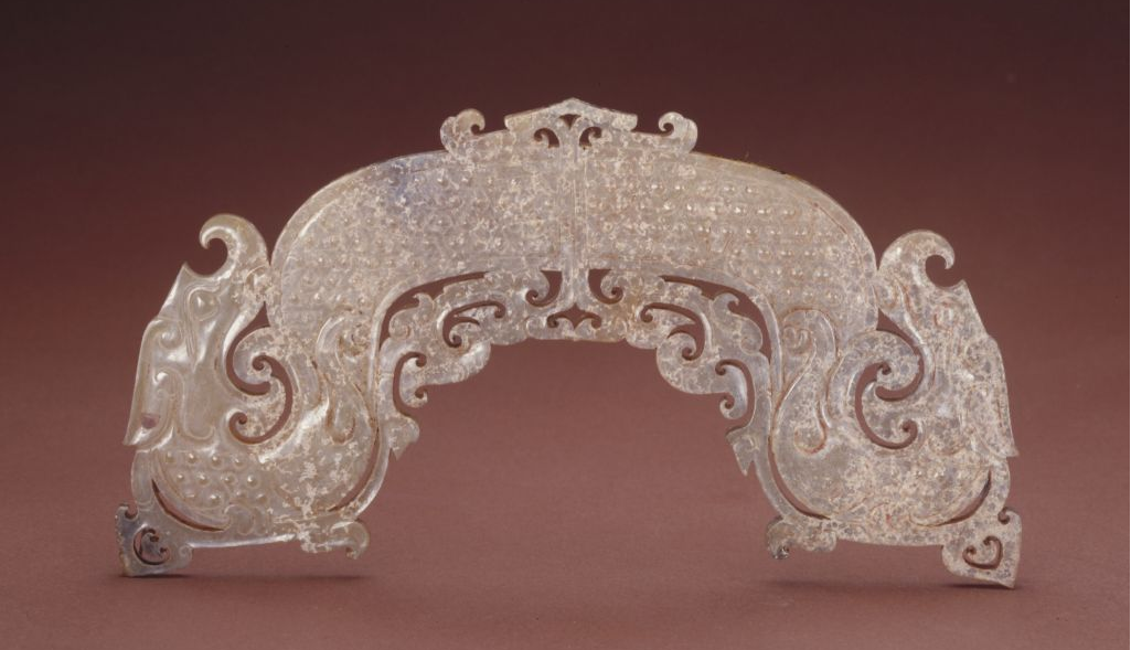 龙首形似兽,耳贴于颈部,上唇厚大,下唇尖细,嘴部镂空且刻有齿纹。璜身多饰以弧线勾连而成的龙身。