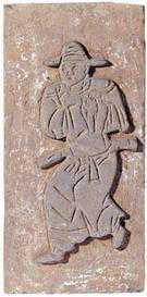 中国国家博物馆藏宋代丁都赛雕砖,长28厘米,宽8厘米,厚3厘米。人物头戴小帽,脑侧簪有花叶,身着长衫,腰后插圆扇一把,双手抱拳作打揖状,足蹬平底靴。丁都赛是北宋开封著名杂剧艺人,平时在“瓦肆”中表演,称之为“露台弟子”。此雕砖是迄今最早雕刻戏曲艺人艺术形象的实物。此雕砖曾为私家收藏,出土情况不明,传出土于河南省偃师一带的宋墓中。