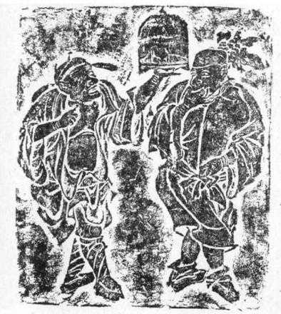1958年4月,河南省偃师市酒流沟水库出土的宋代杂剧人物雕砖,一组3块。左一雕砖雕有两个人物,其一人头戴诨裹软巾,着短衫,右手拇指食指放进口中打口哨,下肢赤露两腿,脚穿快靴;另一人头戴展脚软巾,身穿短衫,左手托一鸟笼,笼中有一鸟,右手食指逗鸟。左二雕砖高约38厘米,长约20厘米,雕砖上刻的人物戴簪花幞头,身着圆领长袍,腰束带,身体前倾,两手展示一帧条扇画,已露出画的上半部。左三雕砖亦雕有两个人物,一人头戴展脚幞头,身穿宽袖长袍,左手执笏右手抚在笏上;另一人头戴软脚幞头,着圆领窄袖长袍,右手端一印匣,左手指着对方似在说话。