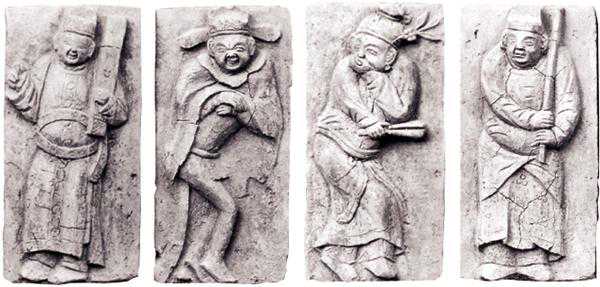 1988年12月,河南省义马市出土的四块宋金杂剧人物雕砖,高31厘米,宽26.5厘米。左一人头戴无脚幞头,身着圆领窄袖长袍,右手抬起作指点姿态,左手执一上宽下窄的大板,应是装孤色;左二人头戴直脚幞头,无贴身之衣,下腰系一块小布遮挡下体,身披斗篷,肩部罩条纹披肩,面部表情滑稽,着奇装,应为副净角色;左三人头裹软巾,左鬓插花,身穿圆领窄长袍,腰系带,右手执一把拍板,左手掩口作嬉笑状,双腿弯曲,右臀上提,姿态滑稽,应是副末角色;左四人头戴无脚幞头,身穿圆领窄袖长袍,腰束软带,双手握一竿于左侧,面部表情呆板,应为末泥角色。