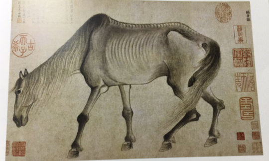 《骏骨图》卷是南宋画家龚开的作品,该图卷在空白的背景上用强烈的单色对比手法刻画了一匹马,展现了恢弘的过往与惨淡现实的对比,让观者产生一种巨大的落差之感。