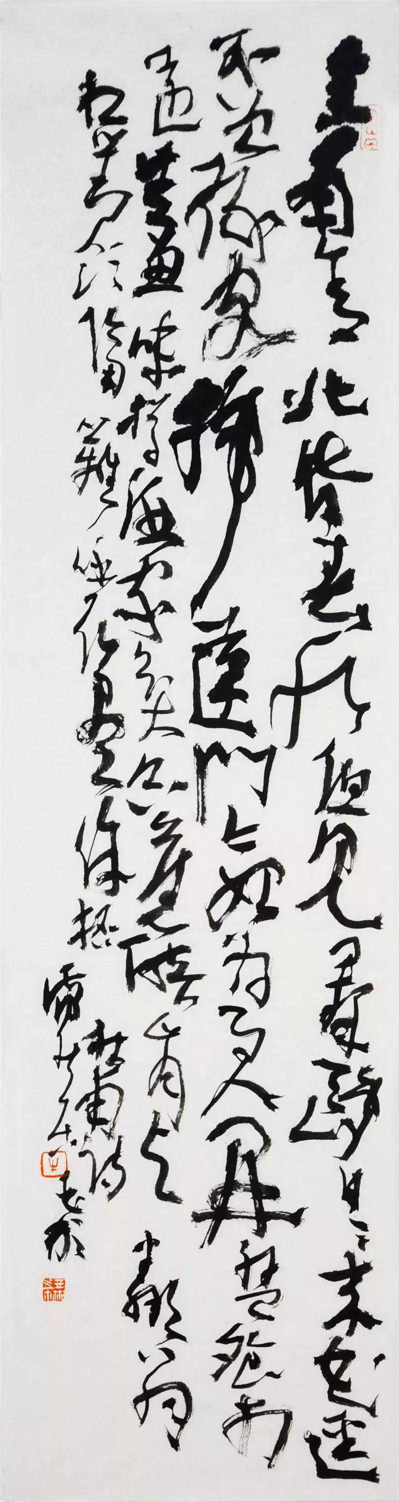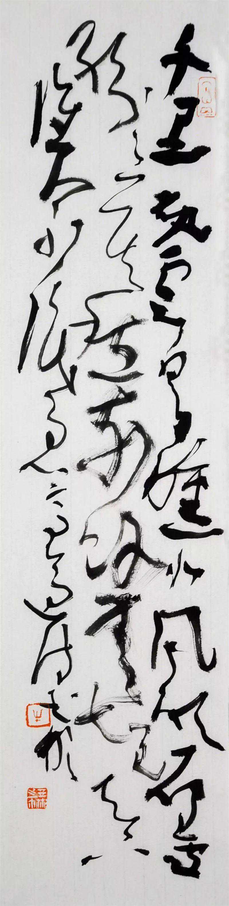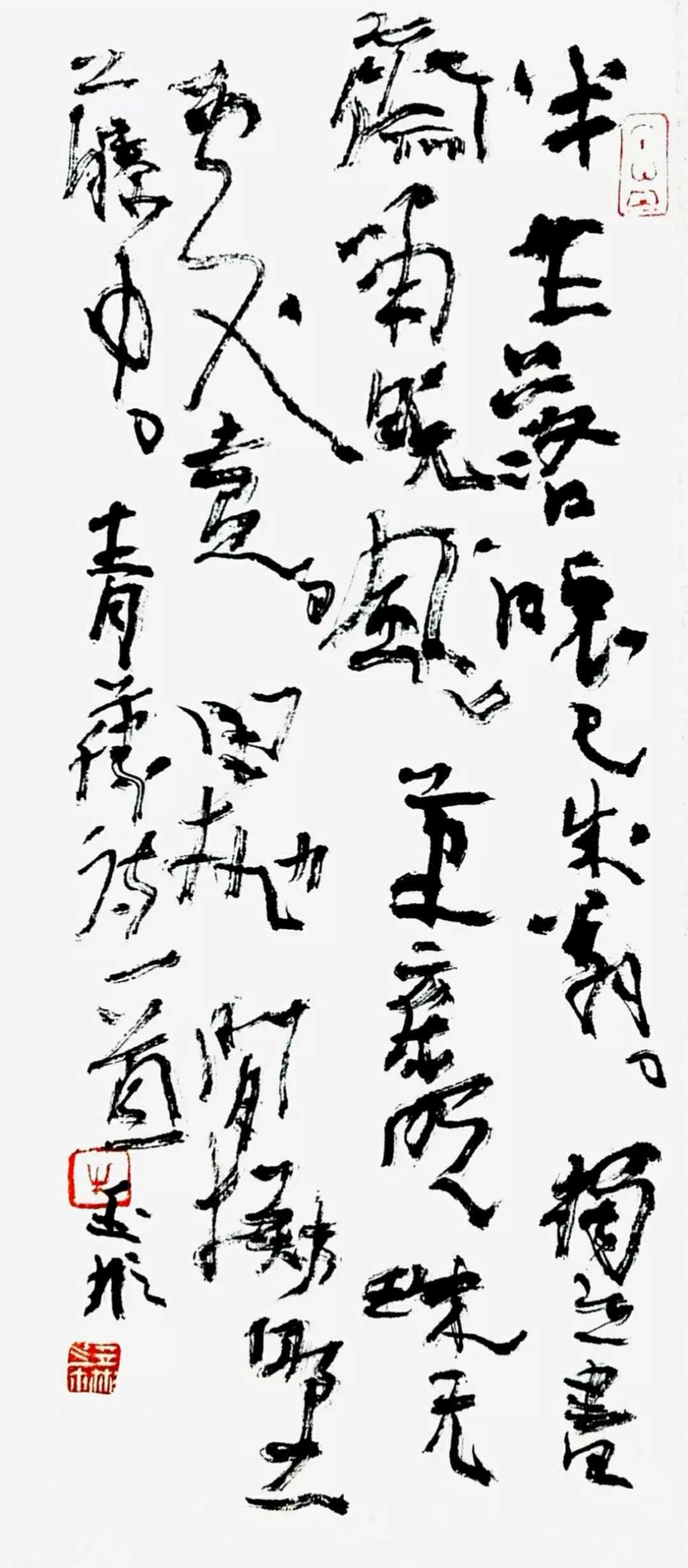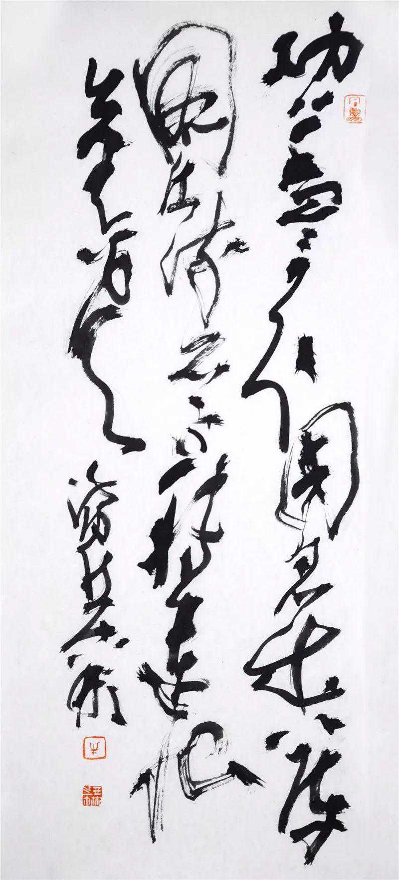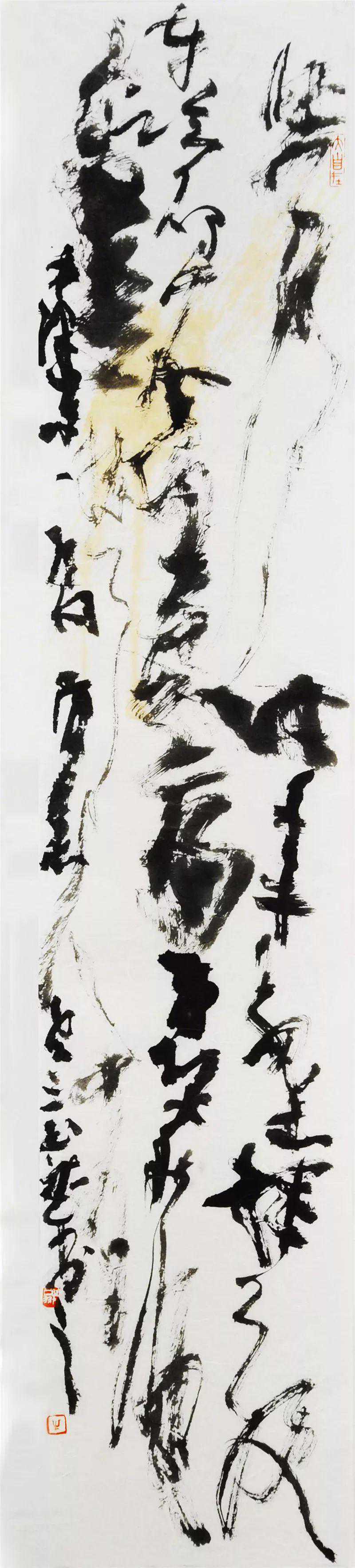 天分高的书家往往青睐草书,牛玉彬也是这样。他在二王行草方面打下扎实功底的基础上,专攻张旭、怀素的狂草,同时参临黄庭坚、王铎等,转益多师,积深培厚。数年下来,其草书已经初具规模,形成了自己的面貌。他的草书具有气息通畅,线条凝练,结体奇巧,富于变化的特点。气息的贯通畅达是草书的重要特征,对于狂草来说尤其如此。观其草书,气息通贯,一气呵成,如江河奔腾,一泻千里,具有排山倒海、摧枯拉朽的宏伟气势。所谓通畅者,不见得是字字相连,但即使是断笔,乃至字字独立,气息仍然可以畅达无滞。要做到这一点并非易事。除了熟练地掌握字法,更重要的是胸有全局,高屋建瓴。牛玉彬的草书充分展示了作者在这方面的过人能力。