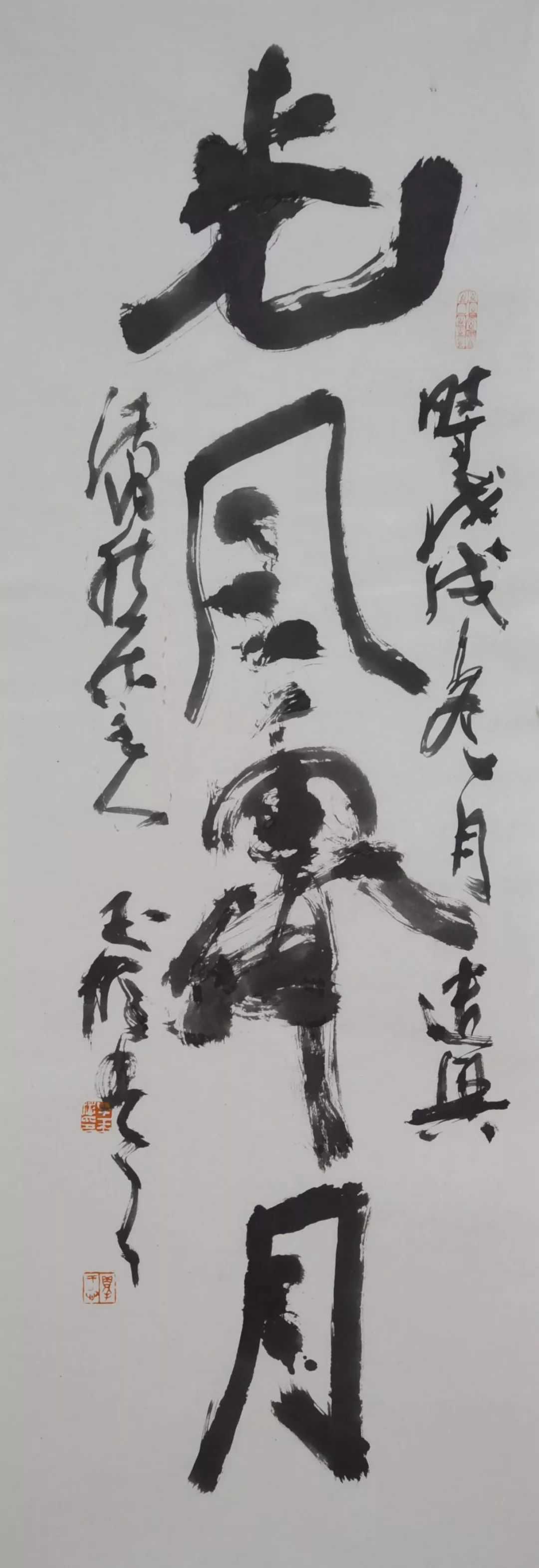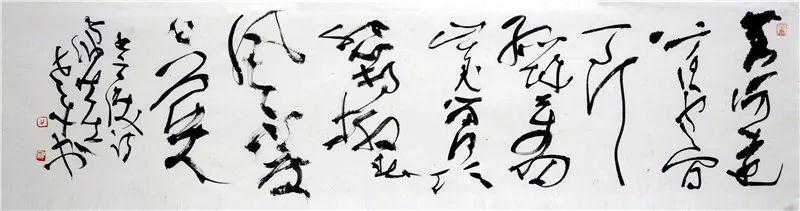 当然,气息的畅达还须建立在高质量的线条的基础上。草书没有高质量的线条是很难做到整体气息畅达的。我们看到,玉彬草书的线条刚劲而凝炼,顿挫有致,收放自如,有良好的质感和巨大的张力。他草书的用笔属于张旭系统,提按变化的幅度比较大,与怀素一分笔的纯中锋线条迥异其趣。一般说来,怀素的用笔较为易学,而张旭用笔学起来难度更大。牛玉彬选的恰恰是这样一条更具挑战性的草书之路。在其草书用笔中,有两点特别值得注意:一是他参用黄庭坚、王铎的草书,善于用点和顿挫峻折,努力在线条的流畅中增加厚重感和丰富的变化;一是他吸取章草用笔的特点,用“激石波”的笔势来调节用笔的节奏。这就使得他草书线条在流畅通贯中体现出清健浑厚的特质和行留得体的节奏。