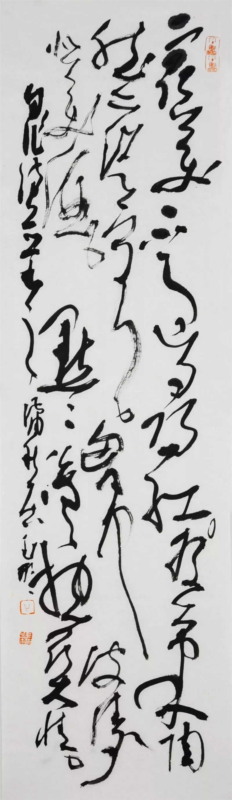 结体奇巧,变化无方,是牛玉彬草书的又一大特色。草书结体无定则,要在书家审时度势、自出机杼,要善于对正常的字体结构进行大胆的解构重组。而牛玉彬在这方面有着明确的意识和很强的能力。他能在符合草法规范的前提下对字进行大胆的解构重组,从而幻化出无穷无尽的奇异形态,然而仔细辨认,其笔下的文字内容又都能一一识别,绝无含混错讹。这不仅仅是一种能力,更是一种意识,一种草书的结体意识。草书创作,乃是以汉字为素材,在飞动的气势中把汉字的点画、起止、行留、断连等要素一一析出,使人们的视觉重点不再停留于汉字的表义层面而深入到书法艺术作品的线条、张力、节奏、情感乃到生命律动的层次。能做到这一点,才是一幅好的草书作品。