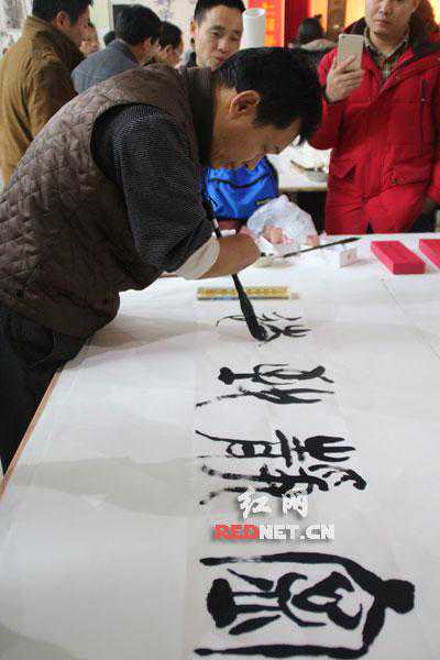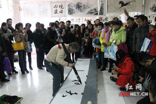 义卖现场展示了来自张敏、洪积茂、蓝爱国、盛育英、杨跃进、涂祖根、莫桂林、王千光、黄再寿、李玉钧等数十名知名书画家捐出的书画作品近300幅。莅临现场的爱心书画家们不仅带来了自己的书画作品,还在现场挥笔泼墨、伏案作画。书画家们现场采风,一幅幅精美的书画跃然纸上,落款、盖印,义卖吸引了众多爱心竞买者,虽然寒气袭人,但现场火爆,尤其是书画家杨跃进手持30斤“铁笔”现场挥毫时,现场惊叹声、掌声不断。当断臂书画家涂祖根用手肘书写时,在场的爱心人士都被他坚强的意志和精湛的书法技巧所折服。