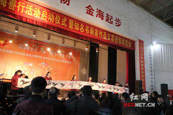 红网长沙1月11(通讯员唐婉欣黄文胜)义卖献爱心,翰墨传真情。1月9日,2016年金海善行活动启动仪式暨知名书画家作品义卖迎春联谊会在长郡雨花金海中学体艺馆举行,湖南省军区原副政委黄祖示少将、中国农业银行湖南省分行常务副行长曾昭才、湖南省文明办公益指导处处长李仕铭、湖南艺术家书画院院长张敏、湖南艺术家书画院秘书长洪积茂、中华知名品牌协会湖南分会会长喻勇杰、长沙金海教育集团董事长杨建新,和来自社会各界的近千名爱心人士齐聚一堂,以现场书画、作品义卖、爱心认购等形式为贫困学子募集善款,济困助学。