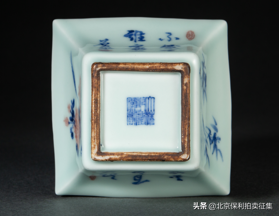 清乾隆青釉地青花釉里红花卉诗文四方斗杯