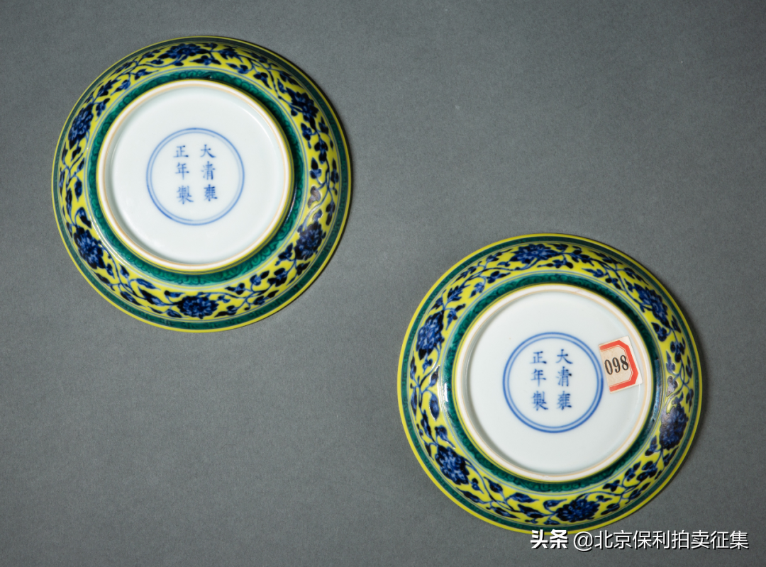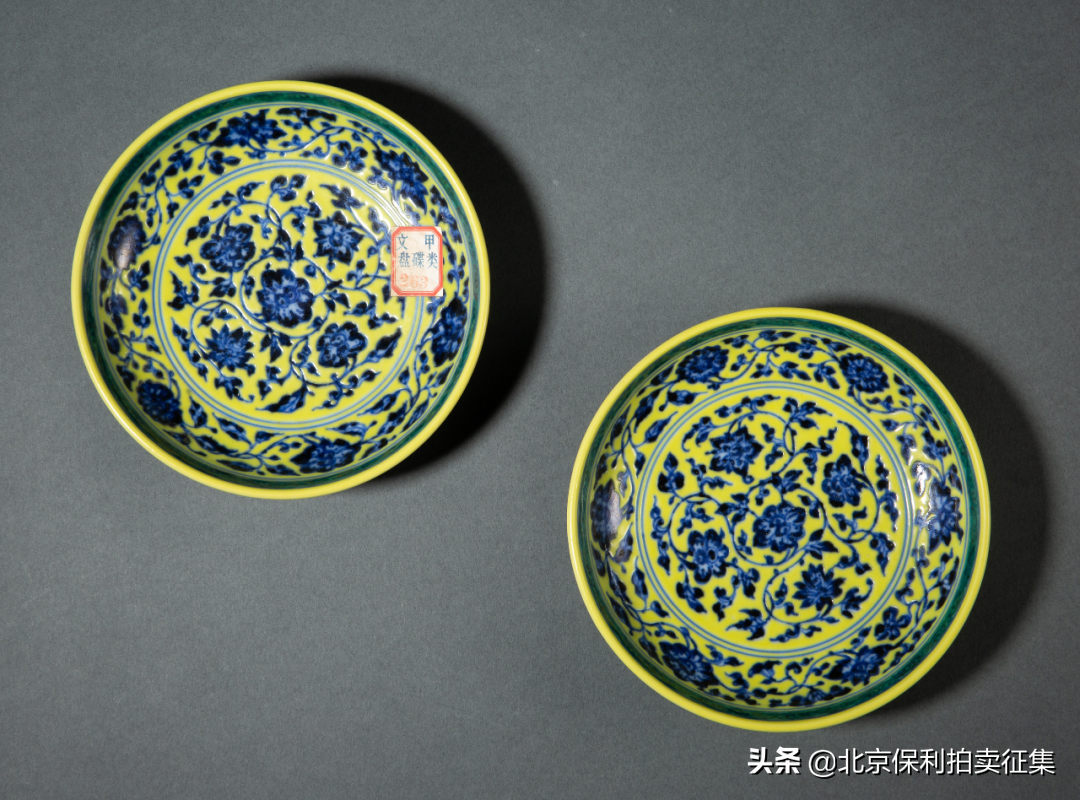 清雍正黄地青花仿明式缠枝花卉碟一对