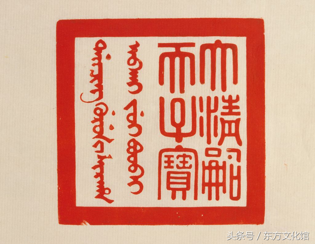此宝宝文为满文和汉文篆书“慈安端裕皇太后之宝”,为同治帝给慈安皇太后上徽号时所制作的徽号宝。慈安端裕皇太后,钮祜禄氏,广西右江道穆扬阿女,咸丰帝为皇子时即侍奉于潜邸。咸丰二年(1852),被封为贞嫔,不久晋封为贞贵妃,后又立为皇后。同治帝继位,被尊为圣母皇太后。曾在同光年间与慈禧太后一起两度垂帘听政,光绪七年(1881)崩逝。其徽号在同光年间累有叠加,同治帝继位时尊称皇太后,加徽号“慈安”,同治十一年(1872)同治帝大婚时又加徽号“端裕”。此宝就是同治帝大婚加“端裕”徽号时为其制作的。
