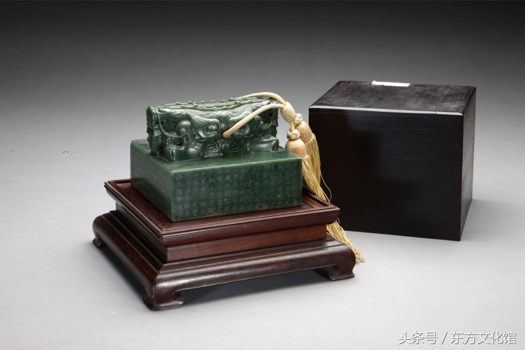 碧玉龙纽“武功十全之宝”,清乾隆,高9.6cm,方12.9cm。清宫旧藏。