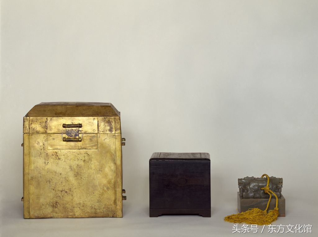 “天子之宝”,清早期,金质,交龙纽方形玺,满文篆书。面11.9cm见方,通高8.3cm,纽高5.1cm。附系黄色绶带及牙牌,牙牌两面分书满汉字“天子之宝匮”。