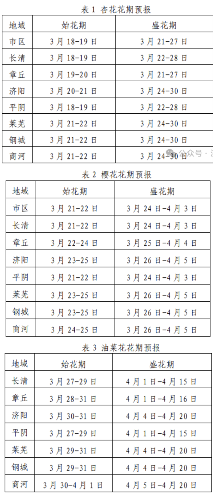 预计济南市2024年杏花、樱花、油菜花初花期较常年偏晚,具体预报如下表。