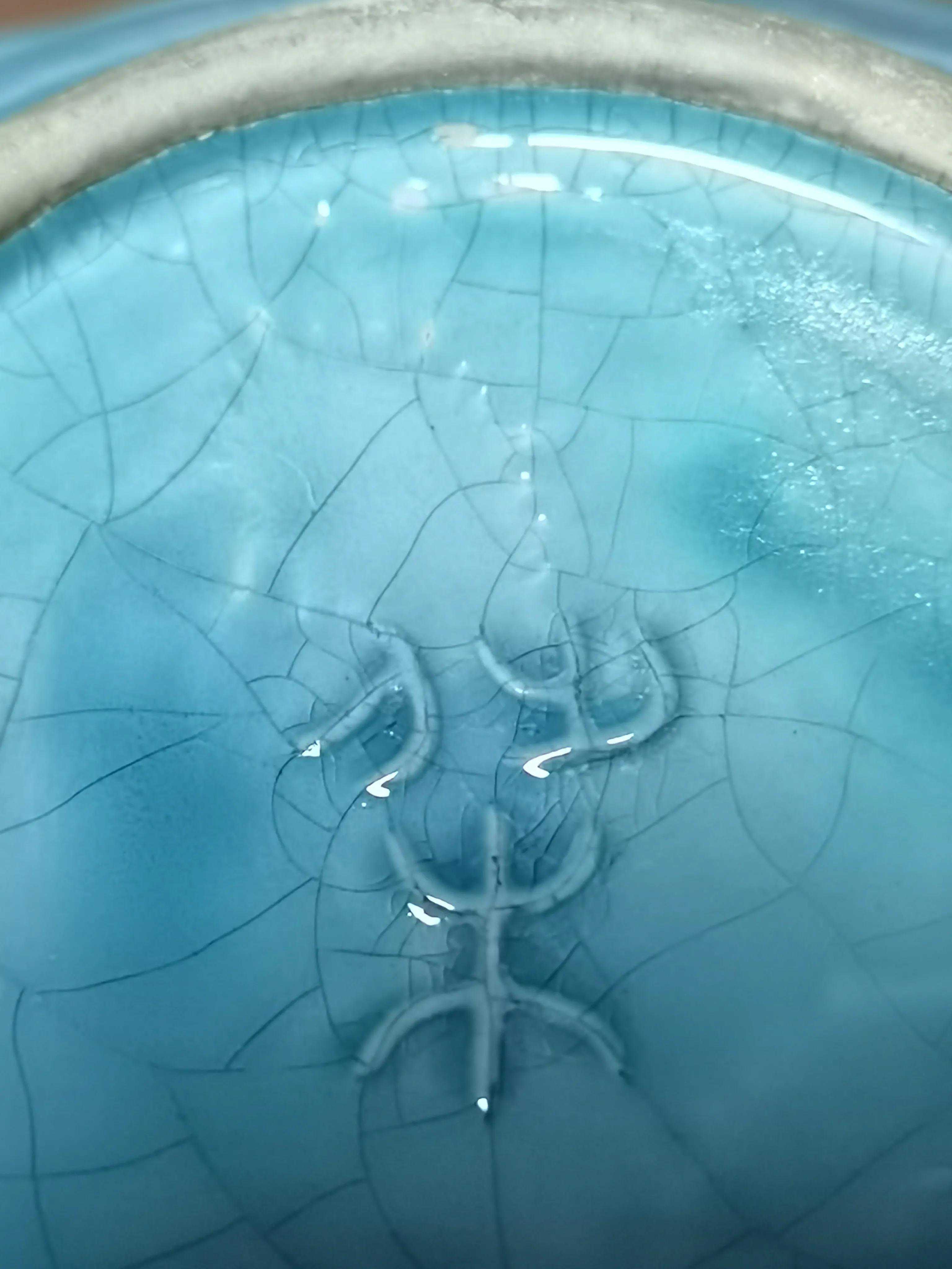 未涂釉的底部周边,呈现瓷胚本来的粗黄色或底无粗黄色(细沙底);釉像滋润细媚,有细纹或无细纹,制精色异。