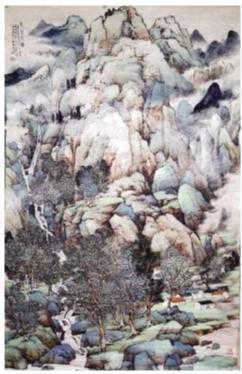 北派山水,自成一家。穆瑞彪的山水画风格之底色和精魂仍属北派山水,但在博采众长、兼容多家的基础上,已将北派的雄豪之气与南派的温婉之韵融为一体。观穆瑞彪的山水画特别是近年的青绿山水画,《寒林沐雪》《云山图》《山村五月》等,整体风貌和气势呈雄浑、博大、苍劲、厚重之形态,其内在气质与神韵则渗透着灵动与温润。二者结合起来,显得毫不生硬,毫无抵牾之处。由此而生成的独具一格、浑然天成的美感,是穆瑞彪青绿山水画的审美价值所在,亦为其艺术特色之一。