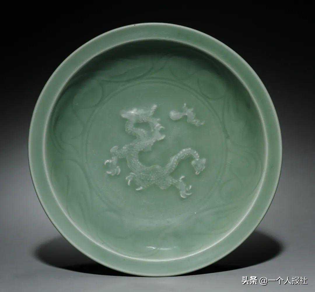 元龙泉窑青釉露胎贴塑云龙纹盘