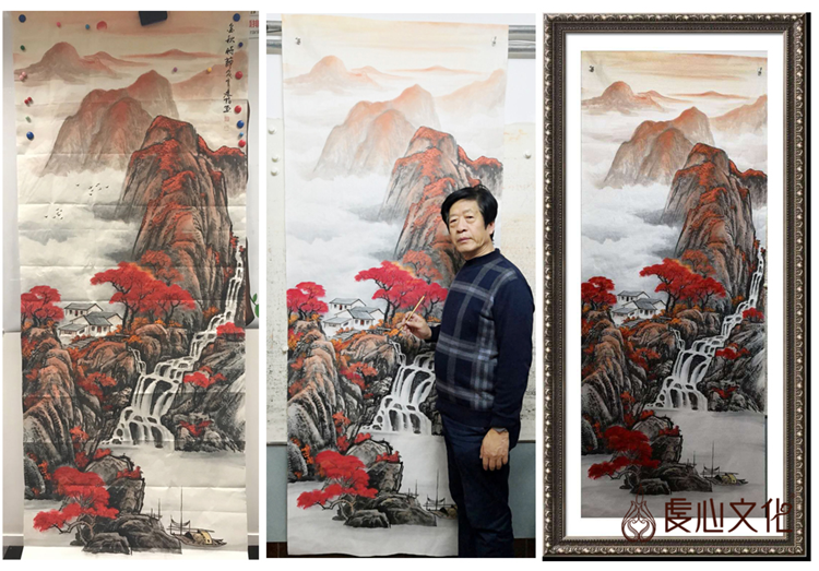举一个例子说明:山东的邹先生想要一幅雄伟壮阔的山水画作,悬挂在新装修的新家的玄关里。但是,对于市面上太多真假参半的画作,他也不知道如何选购适合装饰新家的画作。于是,邹先生通过朋友的介绍,找到虔心文化,联系了我们。我们即时根据邹先生的新家装修风格,从风水学、画家潜力、风格特点、装裱款式等等制定了一套完整方案,推荐了赵振科老师《金秋时节》,最后根据邹先生的个人需求,另外添加了山树船余晖太阳元素,让画面更丰富完美。