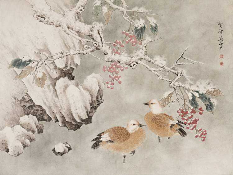 此次“梅景传韵”展的参展艺术家几乎都画过梅花题材作品,展览中,梅景书屋第四代传人顾炫的《雪堆遍满四山中》,将梅花的表现手法重新演绎,更为丰富的肌理效果和色彩演绎,更符合当下年轻观众的视觉感受;同时,作品又不失传统勾线填色的经典技法。通过一件作品,也展现了梅景后人对梅花题材的深度思考和文化传承。