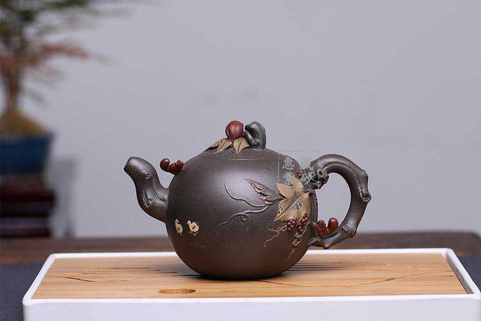 截盖,壶钮上雕塑一颗松果,硕大的果实矗立在枝叶上,使人联想到松鼠藏果囤粮之景。