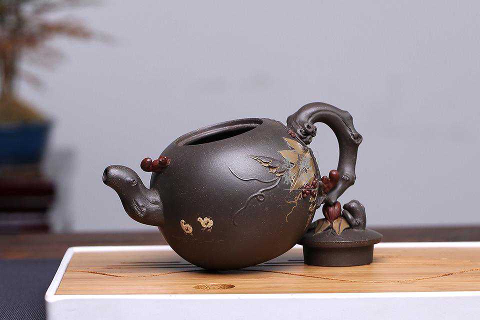 壶身刻绘两只雏鸡,小巧可爱,贴在壶身真如神来之笔,给沉稳的壶型添加了些许引人入胜的灵气。