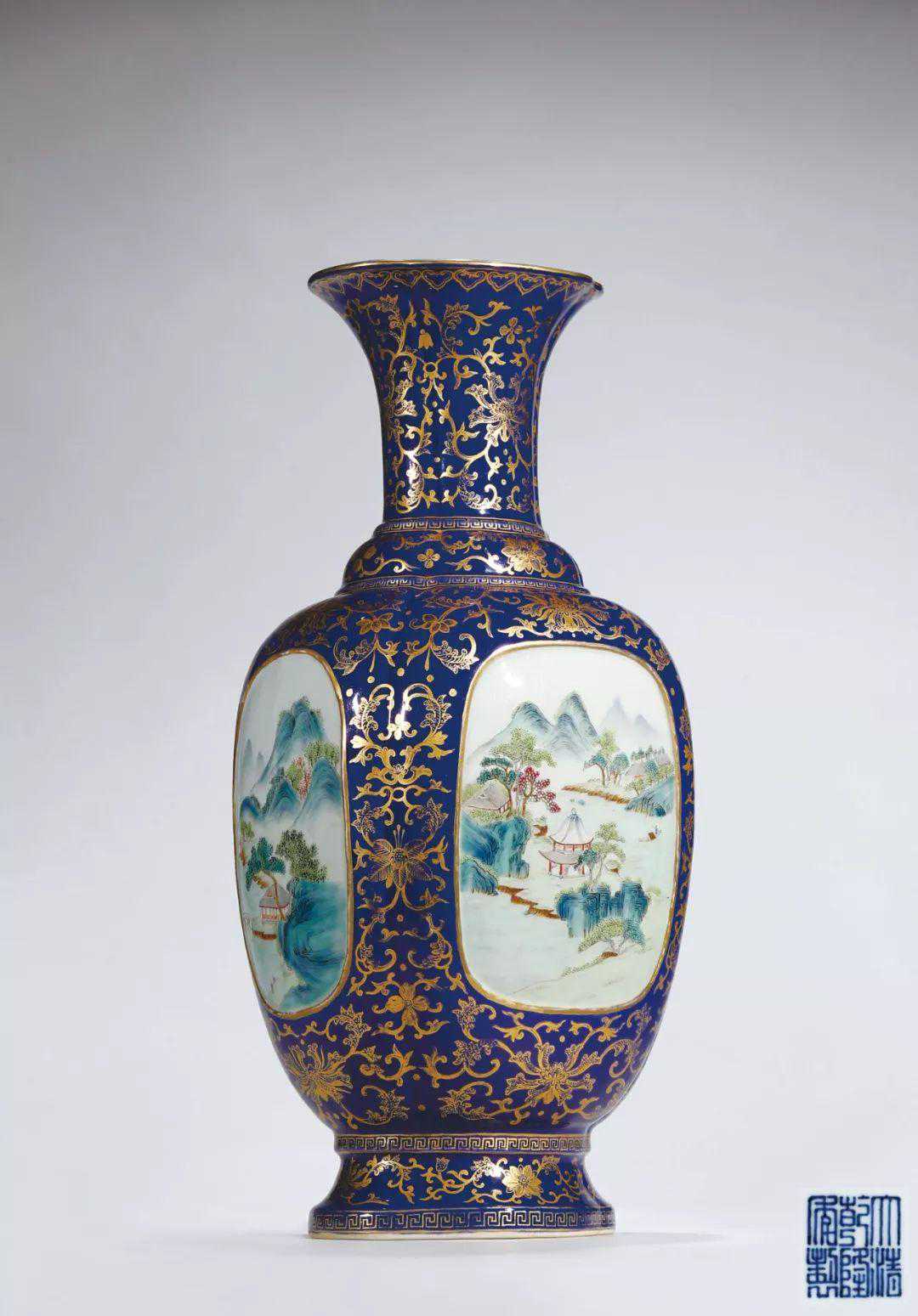 清乾隆·霁蓝釉描金开光山水图海棠口瓶