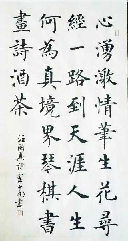 1。卢中南老师楷书作品。汪国真经典诗句“心涌激情笔生花,寻经一路到天涯,人生何为真境界,琴棋书画诗酒茶”