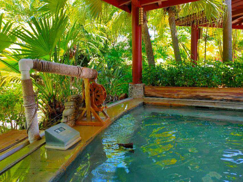除此之外,还很喜欢海洋园林温泉,日式风格,绿树成荫,各式各样的养生小池子藏在红瓦绿树下,薄荷,红酒,陈皮,人参有没有选择困难症呢?没关系,统统都是你的,挑一个,泡吧~