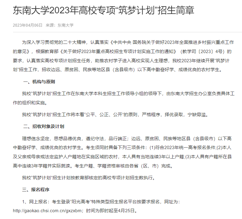 近日,东南大学2023年高校专项计划指出,将依据公布的分省分专业招生计划,按照考生高考投档成绩(含政策性加分)从高分到低分依次择优录取,同时根据该校招生章程中的规定为学生分配专业。