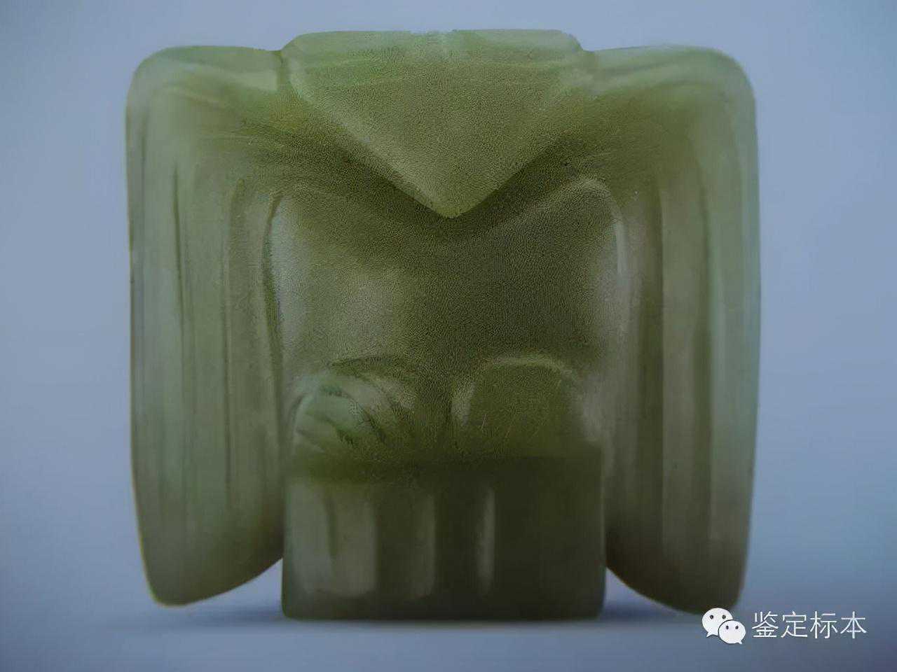 蠟質光,油潤度高,油潤從內部發出來,特別的厚重,厚重的光澤也來自於不平的表面造成的散光,散光分幾重,油潤而特別厚重,這種厚重的光澤不能仿製,只能依靠歲月的積累!!!這正是玉器複雜的光澤表現之一,這種特性也能幫助我們確定玉鷹的年代,光澤的複雜性是對一個鑒定家鑒定能力的挑戰。