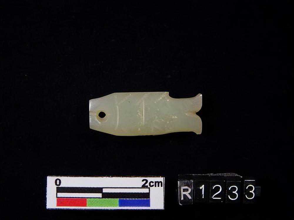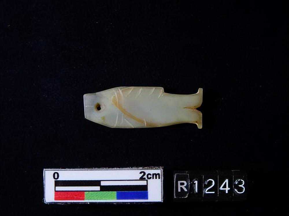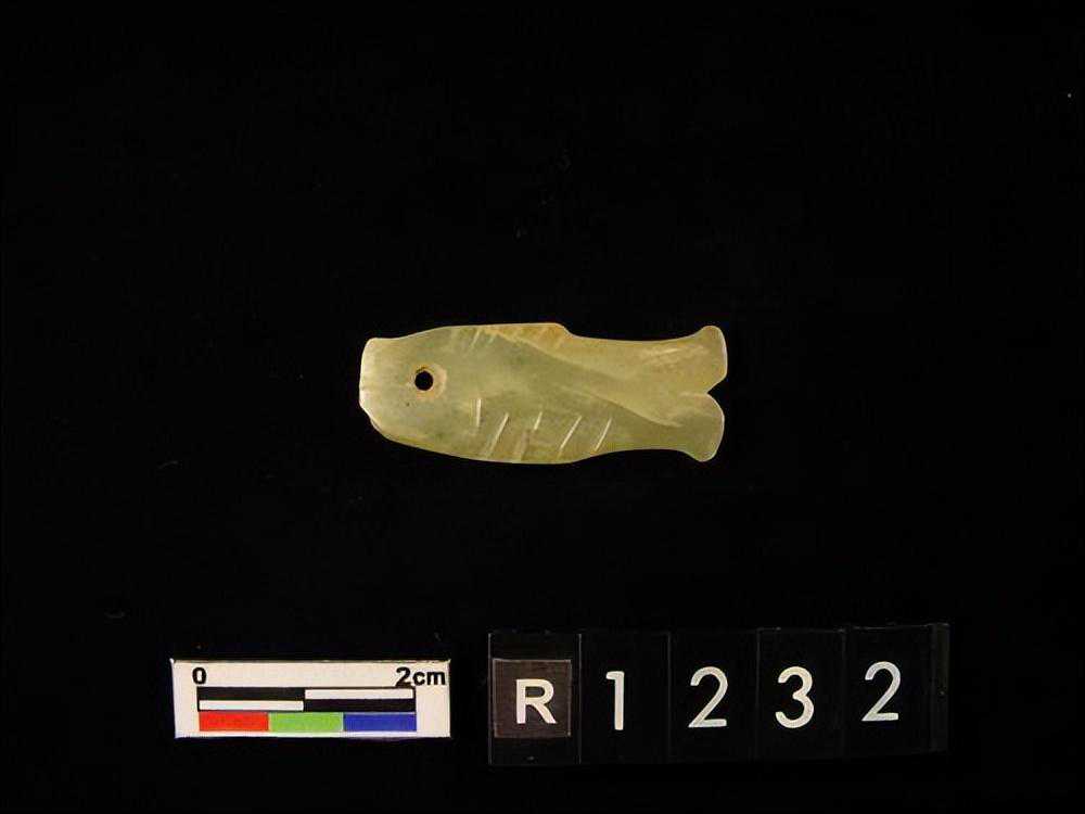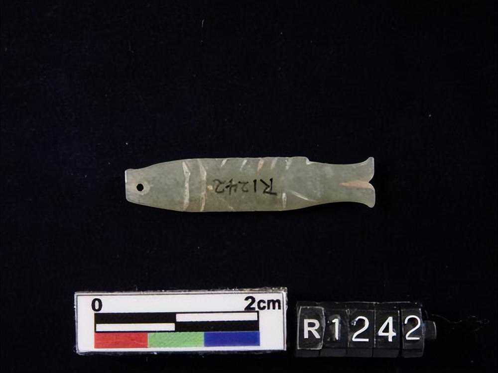 1443墓。。。玉鱼璜,目為一小孔,背腹鰭均為細小之刻文,尾薄如刀刃。。。