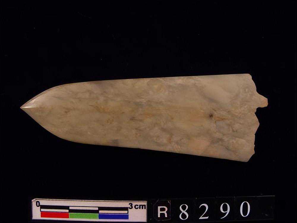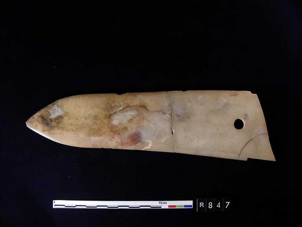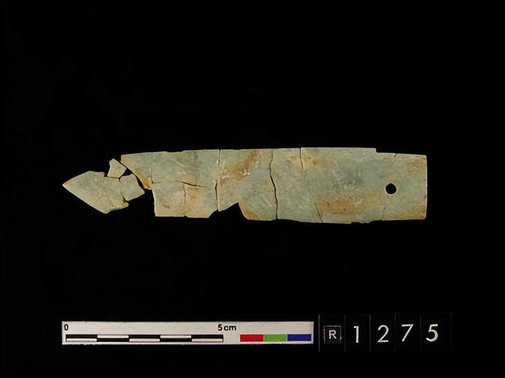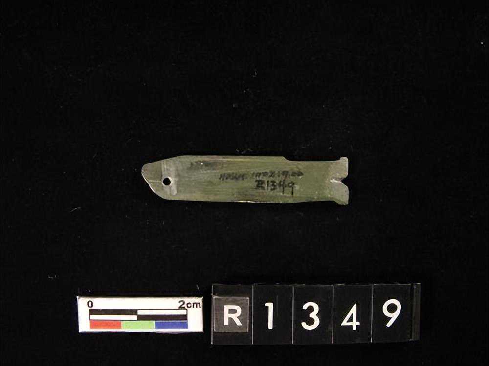 刃尖三角形,中有脊直达近柄处,中有一圆孔,无内,色青灰。