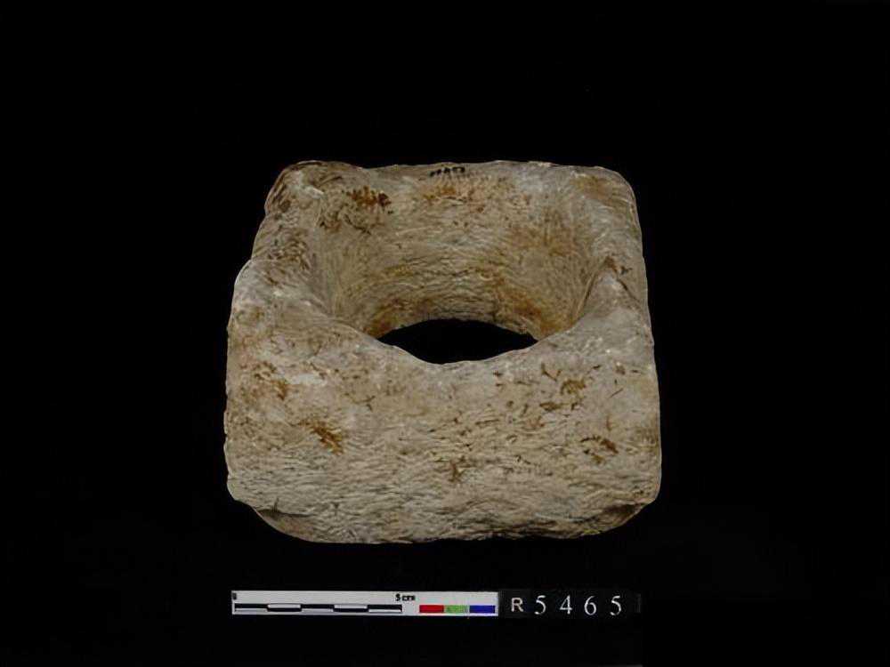 此器方柱状内呈圆筒形,柱中有凸起弦文四道,上下有花文,均阳纹,筒上亦有弦文一道。→色黄白。土中浸蚀过久,石质鬆坏甚多,如海棉。