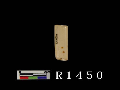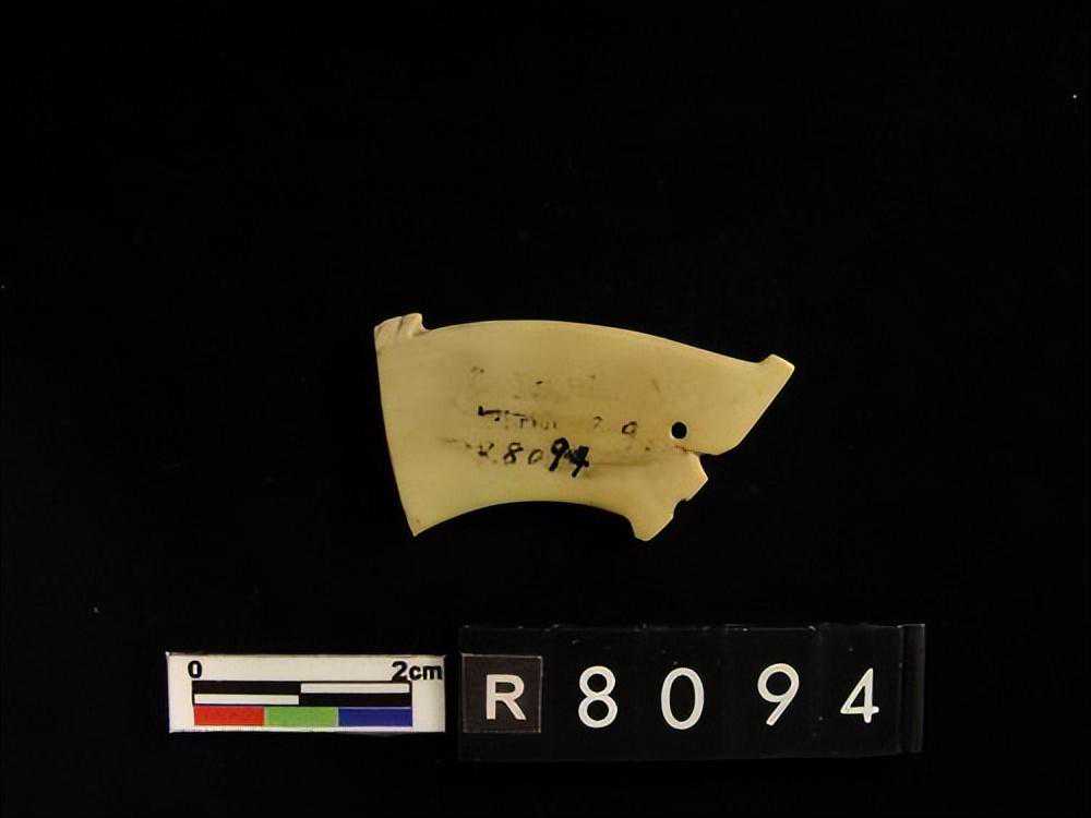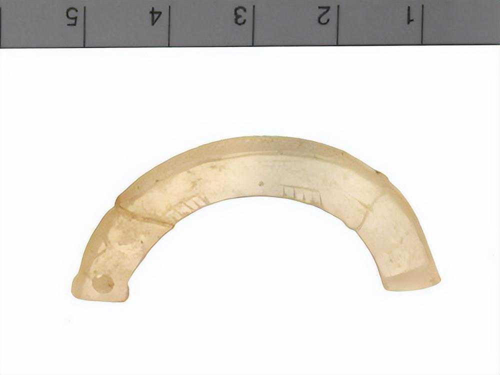 器为弧状,两端有孔,外面刻有带目文之纹饰两组,色白,微有斑。