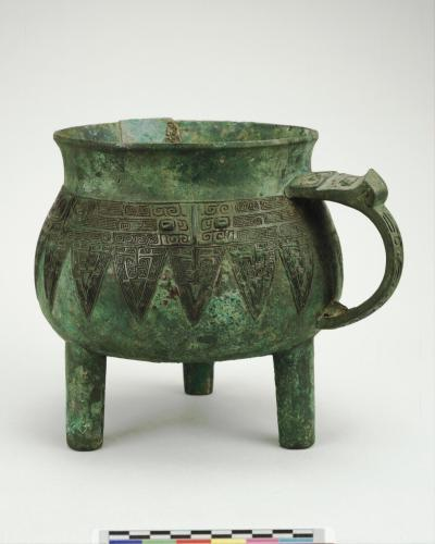 颈饰兽面纹之穿耳二个及大兽面二组,其下为三角雷纹及兽面纹,足兽面纹及雷纹一圈。间有蓝色。有铁痕。圈足有孔二。