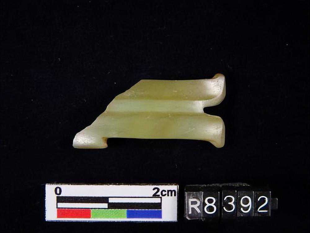 为蟠龙之侧面,口为一长槽,中为一穿,两者相连而实不连,色淡白。