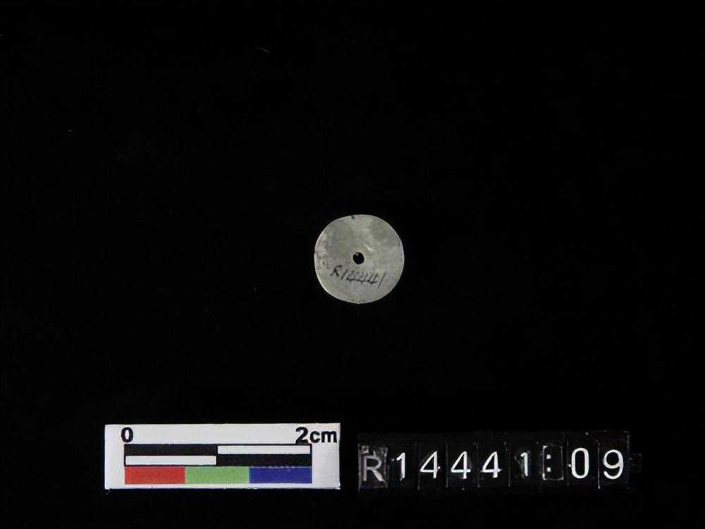 色灰白,杂绿斑,形式同1550-40墓里出的玉凸边璧(R00912)。