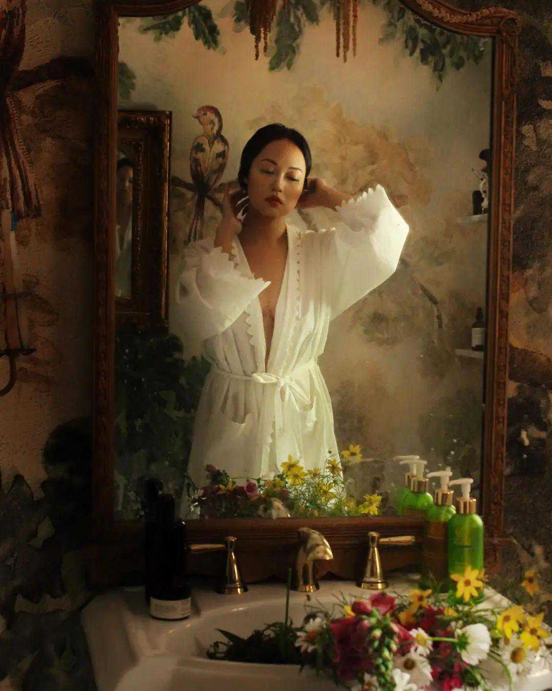 这件连衣裙她用两种方式打开过。右边加了眼镜,换掉了包包、鞋子,光线和背景也更有氛围。▼