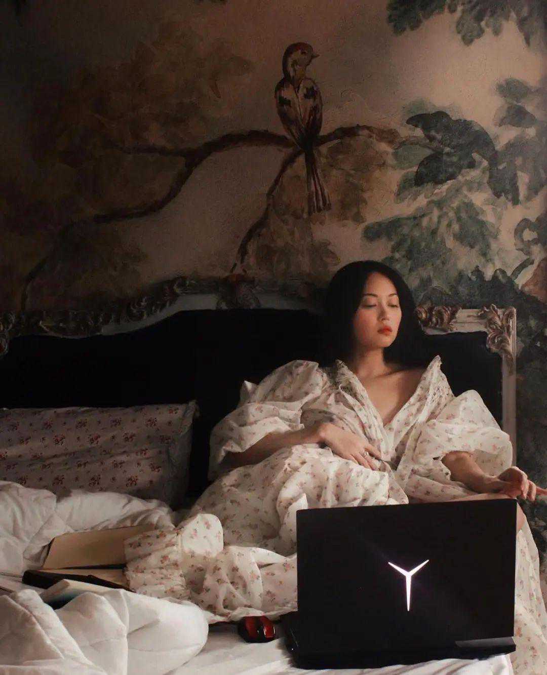 她爱穿的各种裙子,在颜色上也特别有油画氛围,丝绒粉、莫兰迪绿完美融入家里的沙发、绿墙。▼