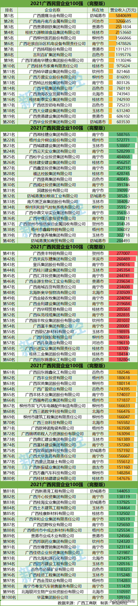 位于防城港的盛隆冶金以584亿元的营业收入独占鳌头,高居榜首;位于河池的南丹南方金属营业收入为326亿元,位居次席;贵港钢铁集团发展迅速,以255亿元的营收收获了第三名;桂林的力源粮油营收也突破了200亿元,挺身榜单四强;医药流通领域龙头企业柳州医药以156亿元的营收位居第五;广西机电、扬翔股份、吉利百矿集团、洋浦南华糖业、桂柳家禽也同时入围了榜单前十。