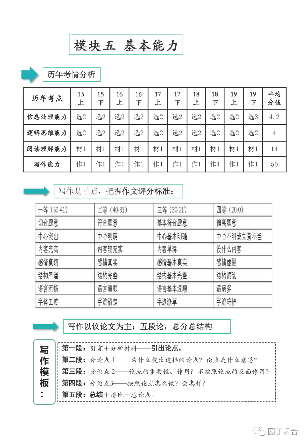 看分值,可以看出重点是作文、材料分析然后阅读理解和选择题。时间安排要提一下,建议,选择题30分钟做完并涂完答题卡,材料分析题、阅读理解题每道都在15分钟内做完,剩下的时间都给写作,至少给作文45分钟。下面我先谈一下作文,因为科目一想通过,作文很重要。