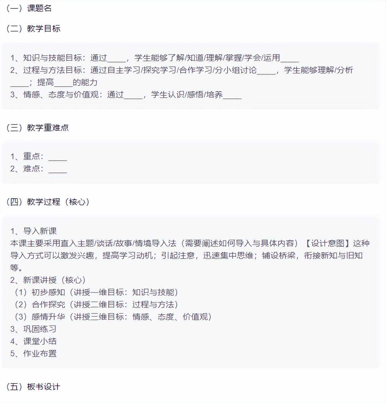 先讲一下教学设计,小学笔试暂时没有区分科目,所以教学设计题可以自由选科目。但不论哪个科目,数学、语文还是科学,都按照下面的模板来进行教学设计: