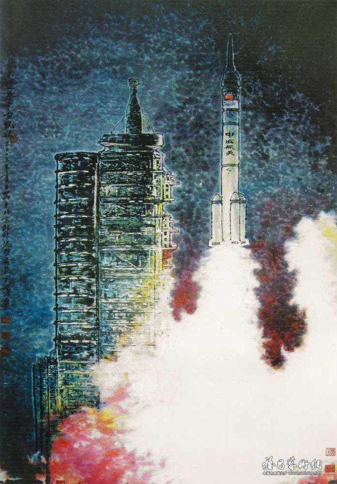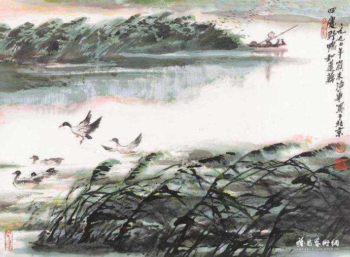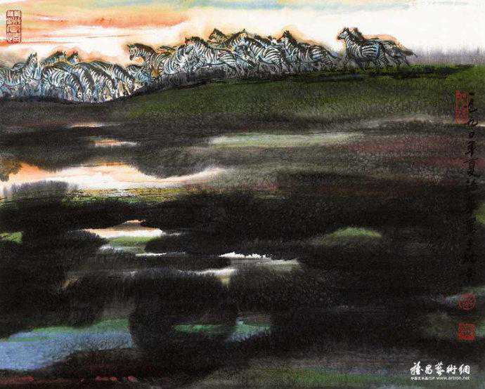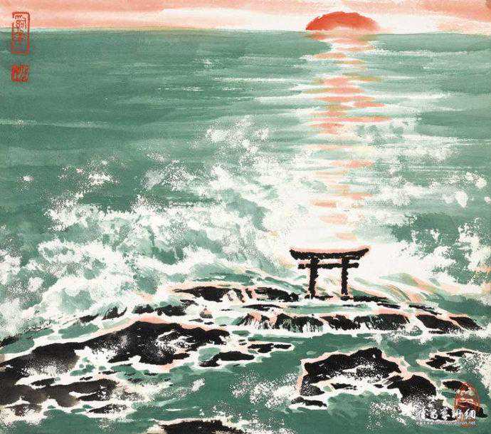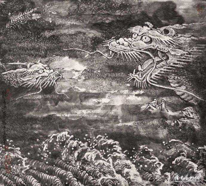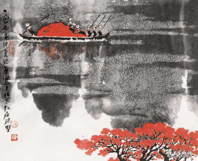 代表作《黄河颂》,此画最早版本一直挂在人民大会堂东门大厅北侧,曾有成千上万人与作品合影留念。作品奔腾壮观的气势,给每一位欣赏者带来强烈的心灵震撼。伫立画前仿如独立危岸,河涛拍岸之声直逼耳际,夹杂着扑面而来的飞溅浪花。这幅长500厘米、宽200厘米的巨型力作。
